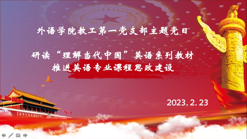 教工第一党支部举行了新学期第一次主题党日活动,主题为“研读‘理解当代中国’英语系列教材、推进英语专业课程思政建设”,此次活动由教工第一党支部书记王薇同志主持,918博天堂(中国)官方网站