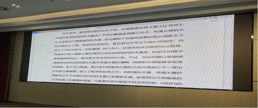 接着,陈教授将夏目漱石的《从军行》与岳飞的《满江红》进行了对比,认为夏目漱石刻意复制《满江红》,生硬地套用我国民族主义诗人书写抗击外敌侵略的豪言壮语,实则体现了他当时真实的扈从国家主义、趋众媚俗的心态。由此可见,夏目漱石与当时社会的大部分精英分子一样出于民族主义义愤,陷入了战争的狂热之中。只是夏目漱石能够不时反思自我,对时代的变化保持着独立知识分子的距离感,甚至带有批判意识。陈教授进一步引用了《我是猫》《三四郎》《满韩处处》等作品,从中也能看出夏目漱石对日本发动殖民主义侵略战争、将军国主义者视为国家民族英雄等行为的不满。