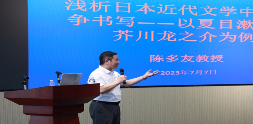 最后,陈教授总结了两位作家对战争的态度,指出夏目漱石、芥川龙之介拥有可贵的道德感和知识分子的精神品格,但同时两人的观点又存在着时代局限性。因此,我们在给予充分理解与尊重同时,也要有所自觉,以历史还原、事实还原的态度对其进行全面立体地分析,最终才能了解战争指涉文学的本质,挖掘出更丰富的历史文化价值。