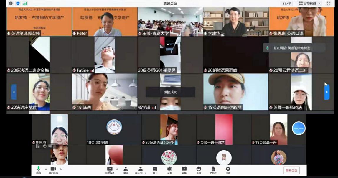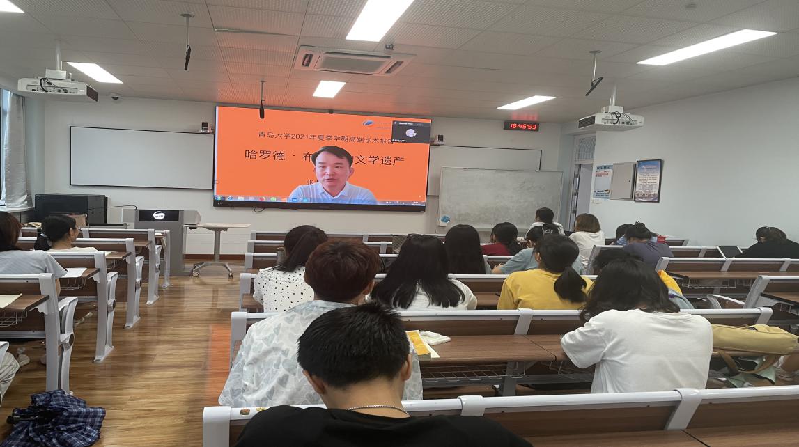 师生做了题为“哈罗德·布鲁姆的文学遗产”的线上讲座。讲座由副院长宫英瑞教授主持,讲座开始,院长卞建华教授对张教授及此次讲座进行了介绍,三百多位师生线上线下同时参会。
