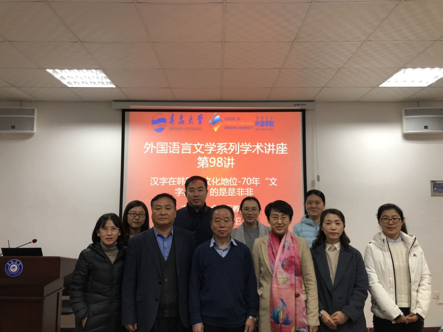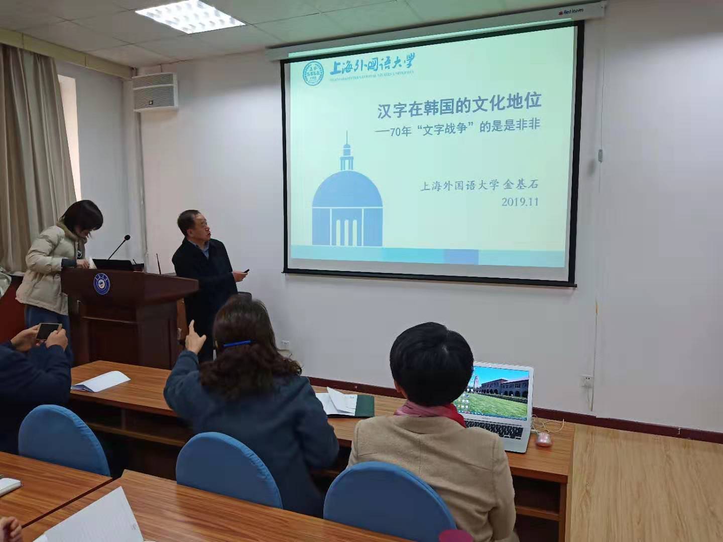 金基石教授应邀做客外国语言学术讲座第98讲,在博文楼312教室作题为《汉字在韩国的文化地位》的专题讲座,院长卞建华、日语及朝鲜语专业的约40余名师生参加。讲座由朝鲜语系主任崔花主持。