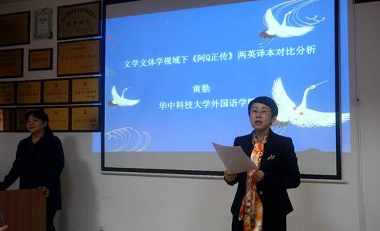10月26日上午9:00,华中科技大学黄勤教授应邀做客外国语言文学系列学术讲座第54讲,在博文楼312会议室作题为 “文学文体学视域下的《阿Q正传》两英译本对比分析”学术报告。卞院长主持,918博天堂