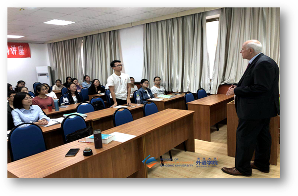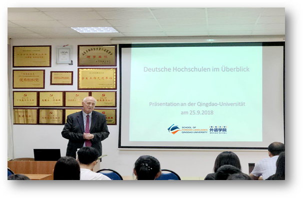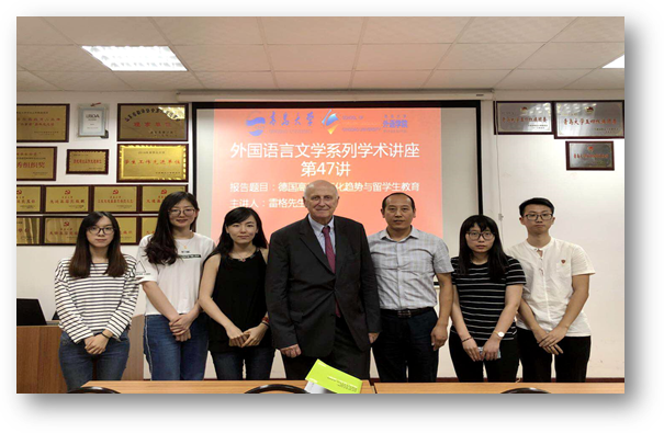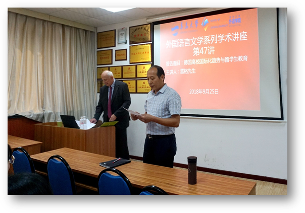 外国语言文学系列学术讲座第47讲,在博文楼312会议室举行作题为《德国高校国际化趋势与留学生教育》主题讲座。德语系主任綦甲福教授主持,德语系50余人聆听了本次讲座。