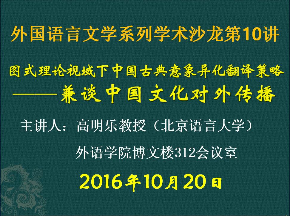 10月20日下午,外国文学语言系列学术沙龙第十讲在博文楼312会议室举行。本次沙龙的题目是“图式理论视域下中国古典意象异化翻译——兼谈中国文化对外传播”,北京语言大学高明乐教授应邀主讲,918博天堂(中国)官方网站
