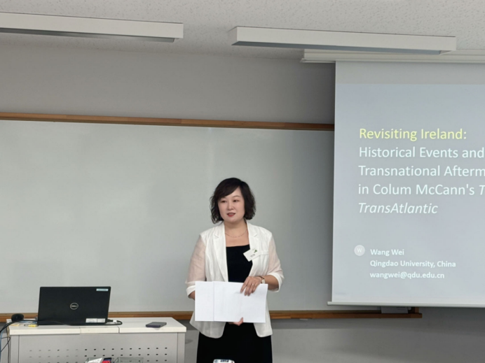 研究中心教师王薇教授在小组发言。王薇教授的发言以当代爱尔兰裔美国作家科伦·麦凯恩的小说《飞越大西洋》为研究对象,结合跨国主义、新历史主义等理论视角,探讨当代爱尔兰移民小说中的新历史叙事、情感叙事、移民叙事与爱尔兰性之间的联结。王教授发言后与同组学者观众进行了较为热烈的互动讨论。会议期间,王薇教授还与国内外学者进行了广泛交流,宣传了我校外国文学研究中心,增进了中外学术了解。