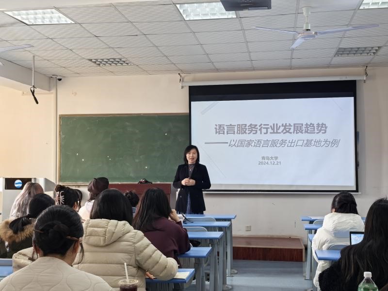 12月21日下午,中冶东方工程技术有限公司翻译中心主任、译审、一级翻译、中国翻译协会理事赵忠会老师作为主讲嘉宾,以国家语言服务出口基地为例,深入剖析了语言服务行业的发展趋势。 她分别以越南文化、影视配音、翻译机测评为案例,生动形象地阐述了语言服务行业的八大发展趋势,并提醒同学们要关注人工与AI的发展,时刻保持危机意识,不断提升自己的专业能力和价值。赵老师指出,未来语言服务行业具备可塑性强、综合素质高、认同918博天堂等特质的人才将更受行业青睐。她鼓励同学们在未来工作岗位中,既要入则为相,也要出则为将。