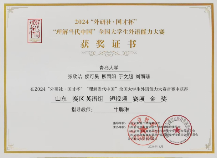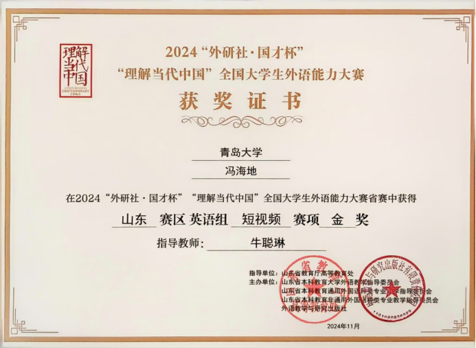 学生在该赛项中发挥出色:2023级冯海地(上合英俄双语创新实验班)在国赛中突出重围,荣获银奖;2022级柳雨阳(语言大数据创新实验班)、2022级于文超(英语师范)所在团队在国赛中荣获铜奖。两组作品由英语系牛聪琳老师指导,牛聪琳获优秀指导教师。