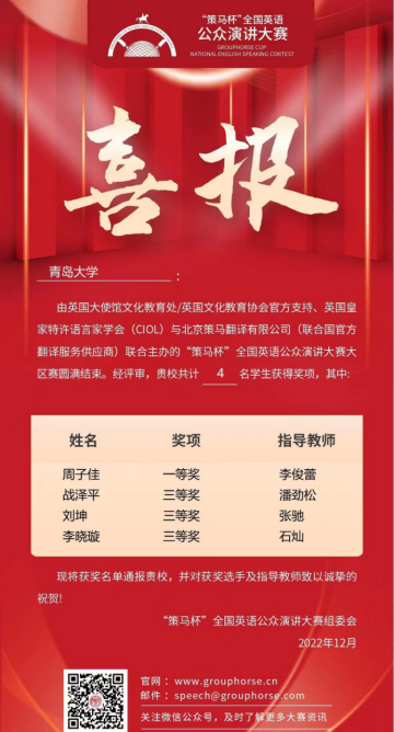 2022年11月27日,“策马杯”全国英语公众演讲大赛南北大区赛圆满落下帷幕,918博天堂(中国)官方网站