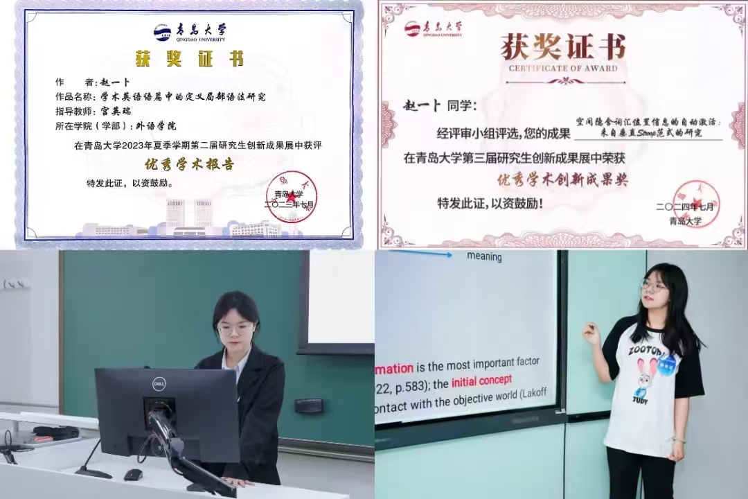 各专业老师的宝贵建议,并获得“优秀学术报告”和“优秀学术创新成果奖”;此外,我前往清华大学、北京师范大学参会交流,并线上参与哥伦比亚大学的认知语言学会议,来自不同学术共同体的老师们从论文结构、研究方法到投稿方向给予了我许多真诚中肯的指导。