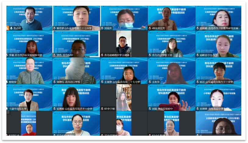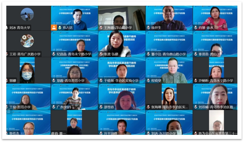 卞建华院长和布占廷副院长主持,李沧区教体局近400名初中英语和小学英语骨干教师相聚云端,聆听专家讲座,并与专家积极互动。