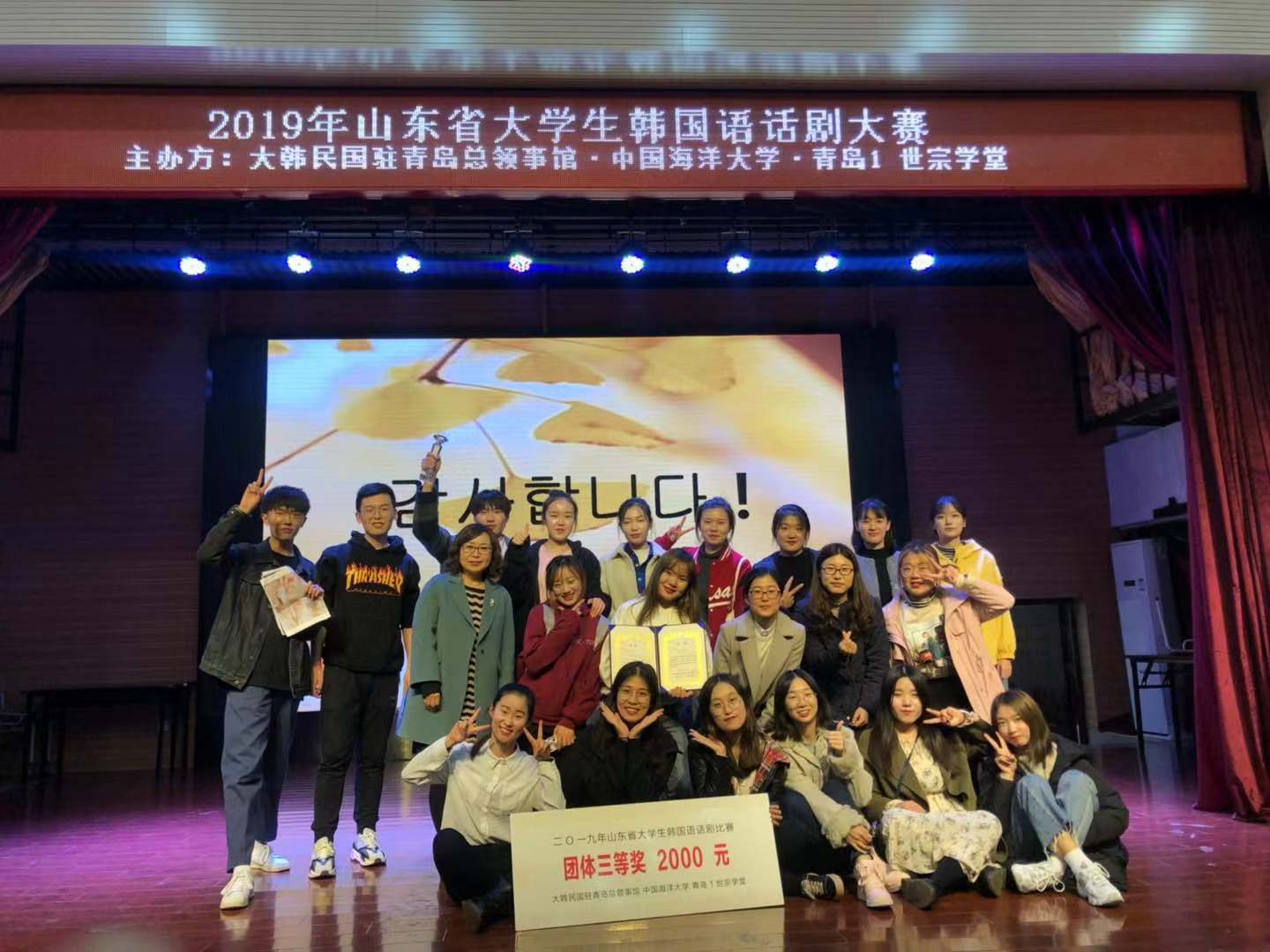 乐海堂拉开帷幕。韩国驻青岛总领事朴镇雄,文化教育领事郑润植等出席开幕式。我校参赛队伍在朝鲜语系沈海兰、张娜、李香芬老师带领下参加了此次话剧大赛。