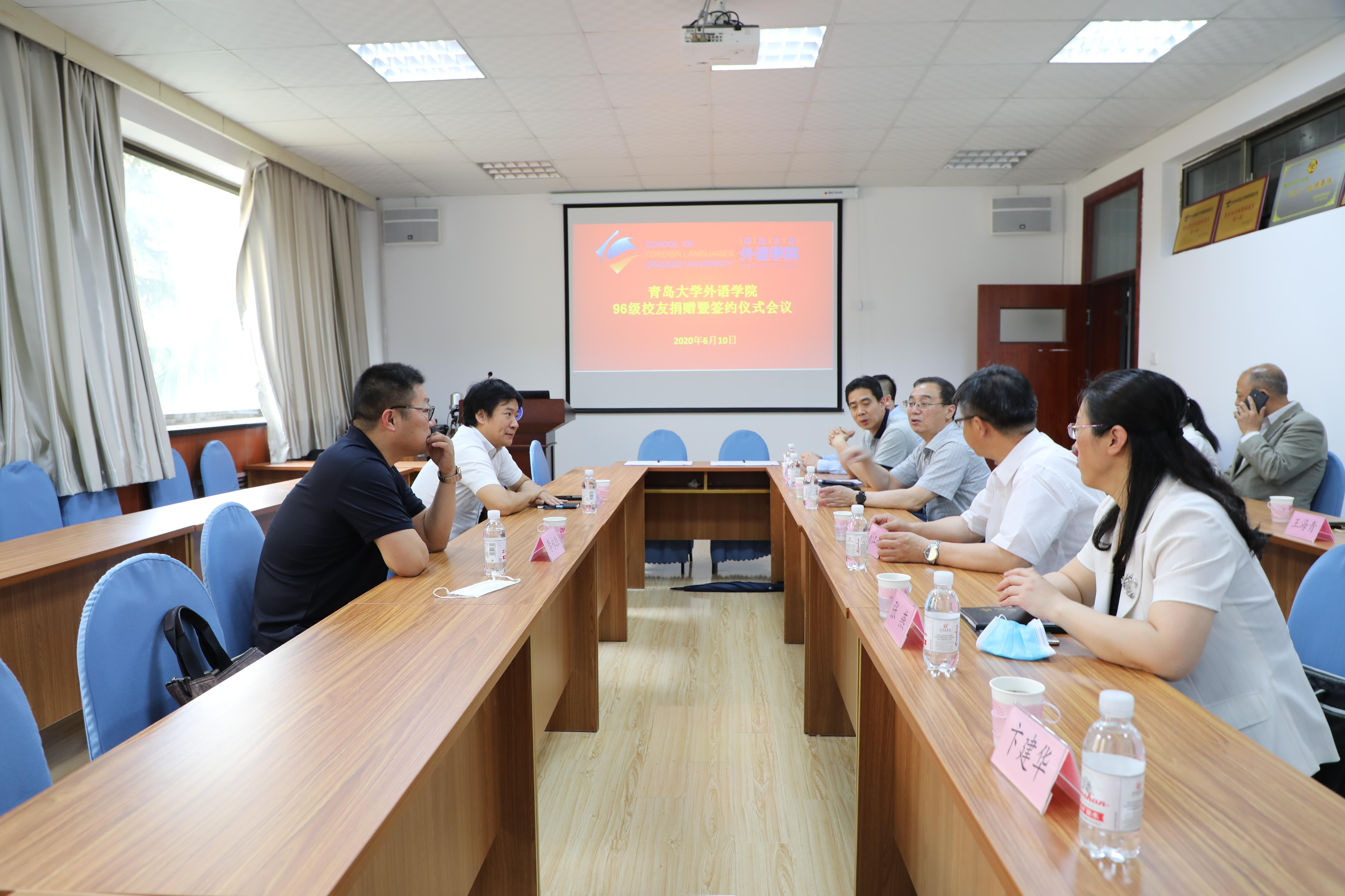 96级日语专业校友、招远帝源服饰有限公司总经理李永胜向母校捐赠设立教育基金签约仪式在博文楼312会议室举行。校党委常委、副校长肖江南、校领导邵彬、校合作发展处、校友工作办公室、918博天堂(中国)官方网站