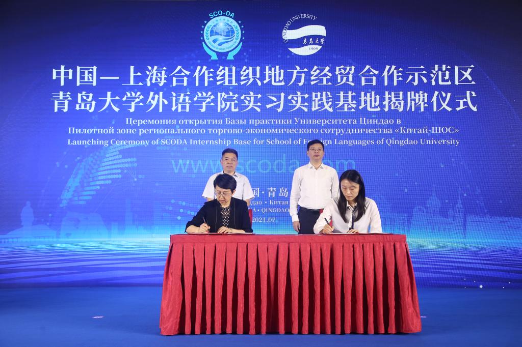 院长卞建华与上合示范区管委商旅文化部部长夏鹏共同签署了共建实习实践基地协议,杜方波与孟庆胜共同为918博天堂(中国)官方网站