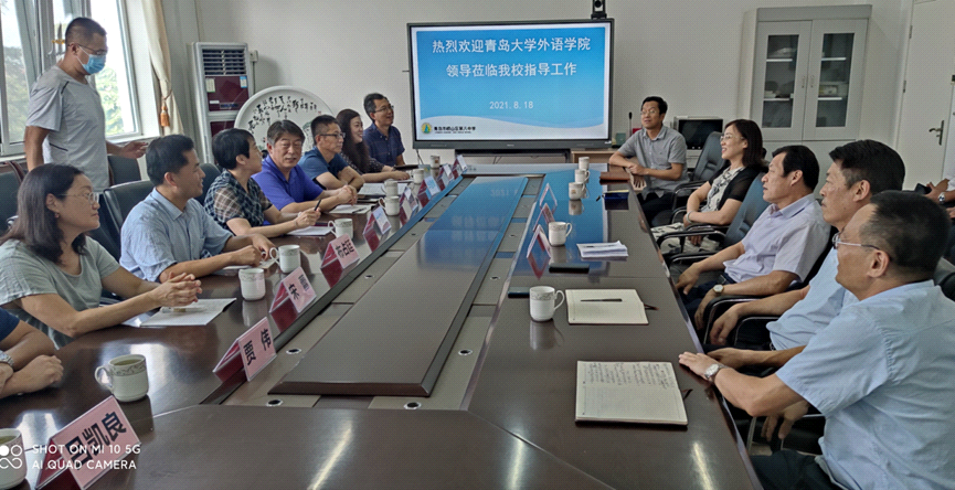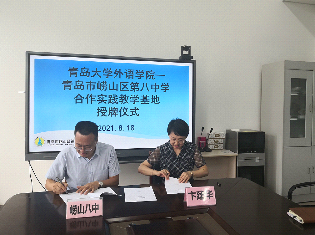 实践教学基地” 揭牌仪式。院长卞建华、副院长布占廷、娄永强,英语教育系主任黄芳、副主任王进福、宋蕾、吕凯良、贾伟,党政办主任华登峰、崂山教体局总督学张清海、崂山区教体局副局长孙咏梅、崂山八中校长肖世强、副校长江昊世和八中外语组骨干教师参加仪式。双方进行了会谈并签署合作协议,仪式由张清海主持。