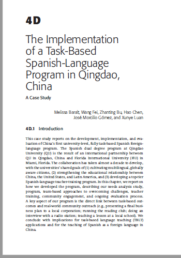 教师王斐、布占廷、陈皓、栾勋业与佛罗里达国际大学(FIU)教师Melissa Baralt, José Morcillo Gómez在The Cambridge Handbook of Task-Based Language Teaching(《剑桥大学任务型语言教学手册》)合作发表论文The Implementation of a Task-Based Spanish-Language Program in Qingdao, China(《基于任务的西班牙语教学项目:以中国青岛大学为例》)。