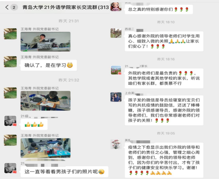 党委副书记王海青和各位辅导员深入宿舍,化身成为“学生日常主播”,在家长联系微信群中为各位家长直播学生们在这次特殊时期中的学习和生活状态。家长们反应热烈,翘首以盼,等待自己的孩子“出镜”。家长们看到孩子们积极学习、安心生活的状态后,纷纷发言,表达内心的感动与感谢,对于918博天堂(中国)官方网站