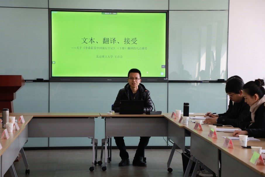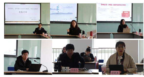 徐爱真副教授作为项目子课题负责人汇报了各子课题的推进情况。参与《中国》项目的硕士生宋丽宸和章乐意分别以“机辅翻译译前编辑及翻译软件测试”和“《中国》翻译中的史籍查证”为题进行了经验交流。