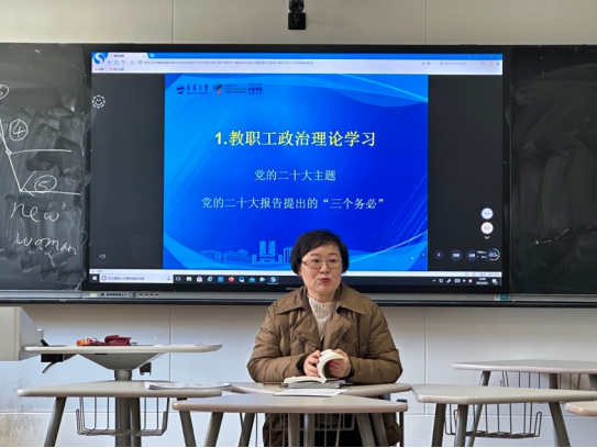 随后,王薇老师带领英语系教师进行教职工政治理论学习,结合“党的二十大主题”和党的二十大报告提出的“三个务必”思想,结合自身教学工作实践,分享了心得体会。