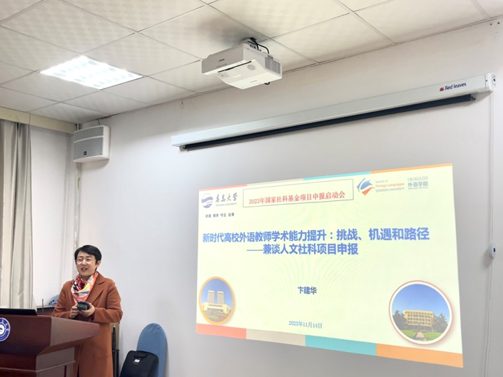 卞建华院长分析了新时代、新科技革命、人工智能给外语教师带来的挑战和机遇,并指出外语教师应积极关注学科前沿,把握国家发展脉搏,将课题申报与国家战略紧密对接起来。同时,还要打通语种界限,跳出外语看外语。其次卞院长结合自己的国家社科项目分享了撰写申报书的心得。最后,她鼓励老师们要勇敢面对挑战,不必恐慌、不必排斥,而是要主动应变、努力扎根,并强调只有不断更新理念、提升自身能力,才能实现918博天堂
