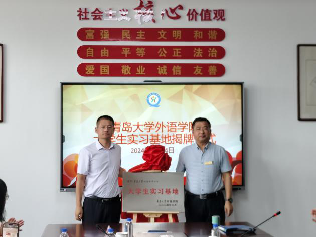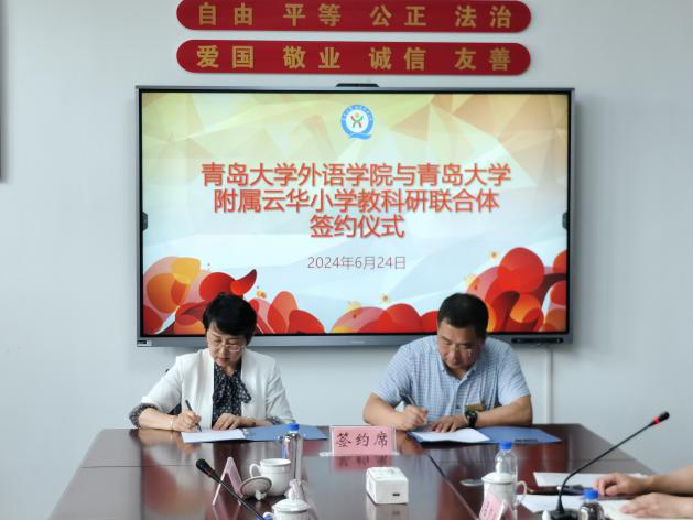 在青岛大学附属云华小学调研时,云华小学校长刘学友、副校长李守业、挂职教师英语教育系副主任吕凯良老师和青岛中仁集团董事长张述仁带领918博天堂一行参观了学校以“两楼两苑一基地”为特色的校园文化。座谈交流时,刘校长对吕凯良老师在校园文化建设和学科发展方面的工作给与高度认可,双方就教育教学、人才培养、师资队伍建设等方面进行了深入交流,卞建华和刘学友签订了建设教科研联合体合作协议书,周伟和刘学友共同为“大学生实习基地”揭牌。