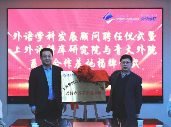 胡开宝教授和李建波院长一起为上海外国语大学语料库研究院语料库教学示范基地揭牌