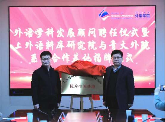 胡开宝教授和马泽刚副处长一起为上海外国语大学语料库研究院优秀生源基地揭牌