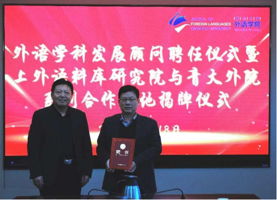随后举行了隆重的聘任仪式,陈涛为胡开宝颁发了青岛大学外语学科发展咨询专家委员会顾问聘书。