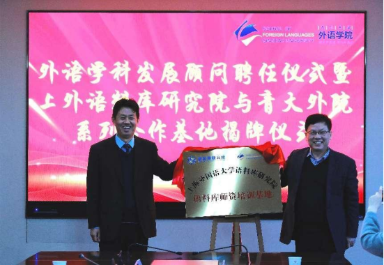 胡开宝教授和钟永光处长一起为上海外国语大学语料库研究院语料库师资培训基地揭牌