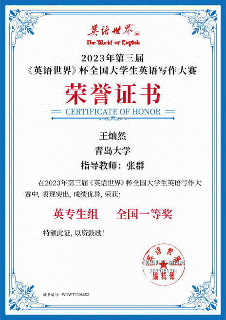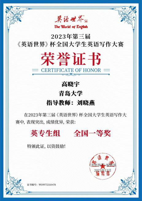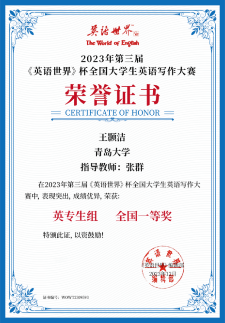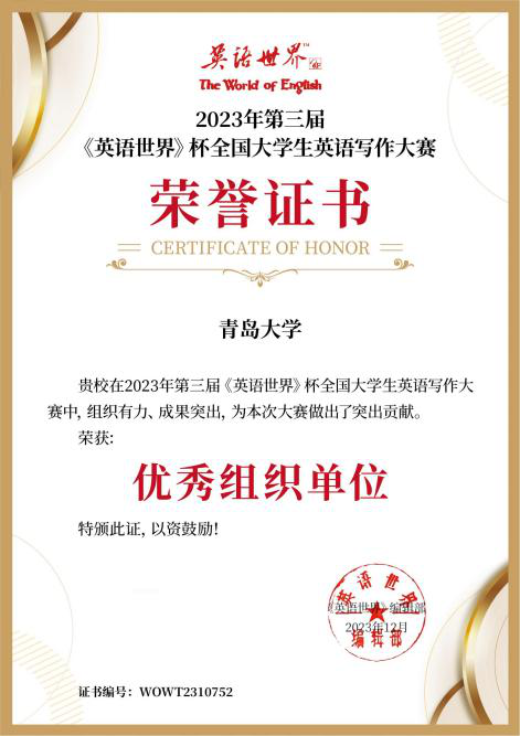 学生参加了第三届《英语世界》杯全国大学生英语写作大赛并喜获佳绩。英语系22级王灿然、王颢洁,23级高晓宇三名同学荣获全国一等奖,艾江宇等六名同学荣获全国二等奖,徐梦欣等六名同学荣获全国三等奖,刘雨彤等四名同学荣获优秀奖,918博天堂(中国)官方网站