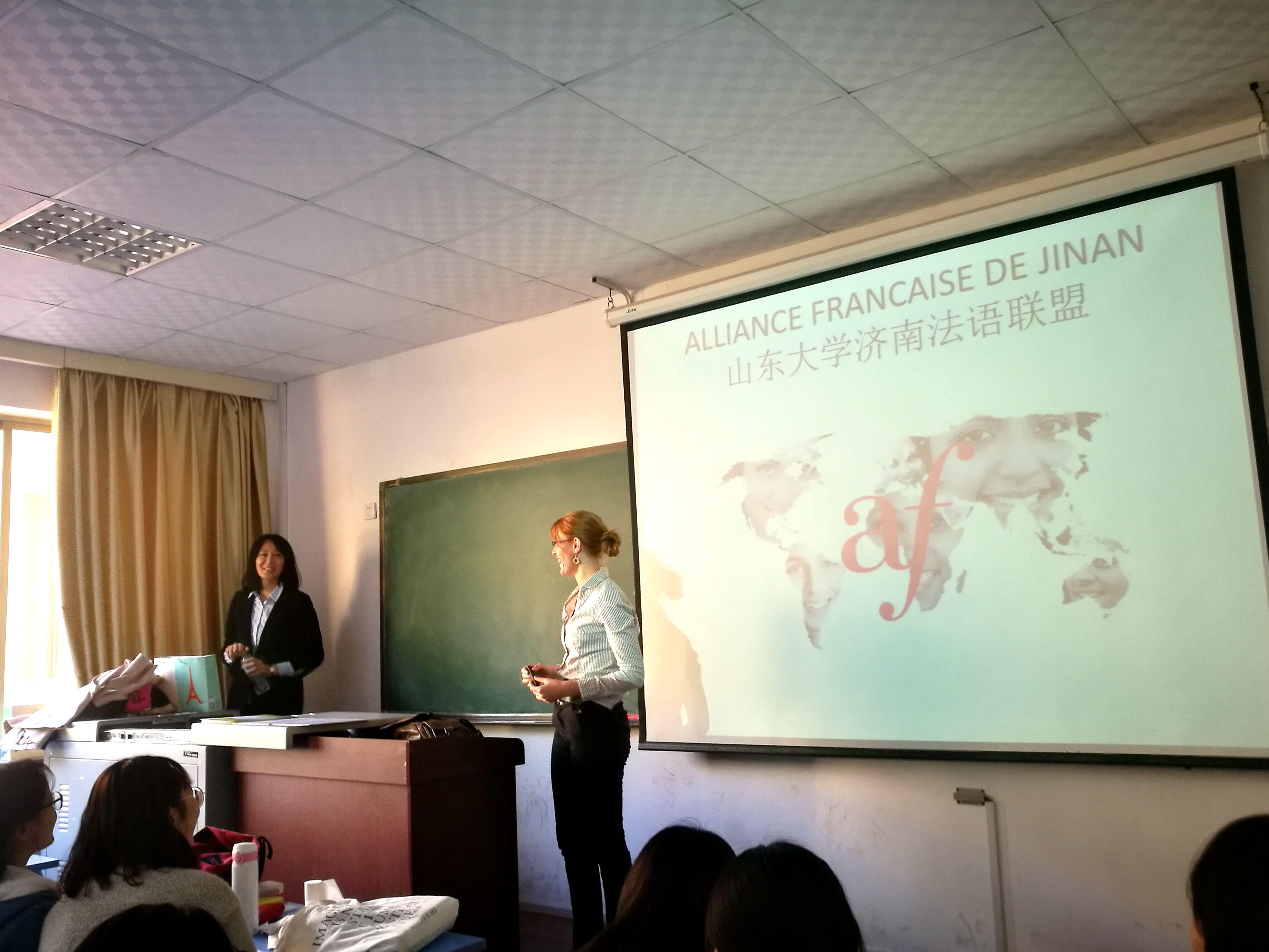 4月25日上午,法国高等教育署济南分处负责人苑婧姝、法语联盟(济南)校长Miquau女士为法语系师生举办宣讲会,分别向大家介绍了法国高等教育的现状、优势以及法盟的文化项目,并在活动过程中与同学们进行了积极的互动。