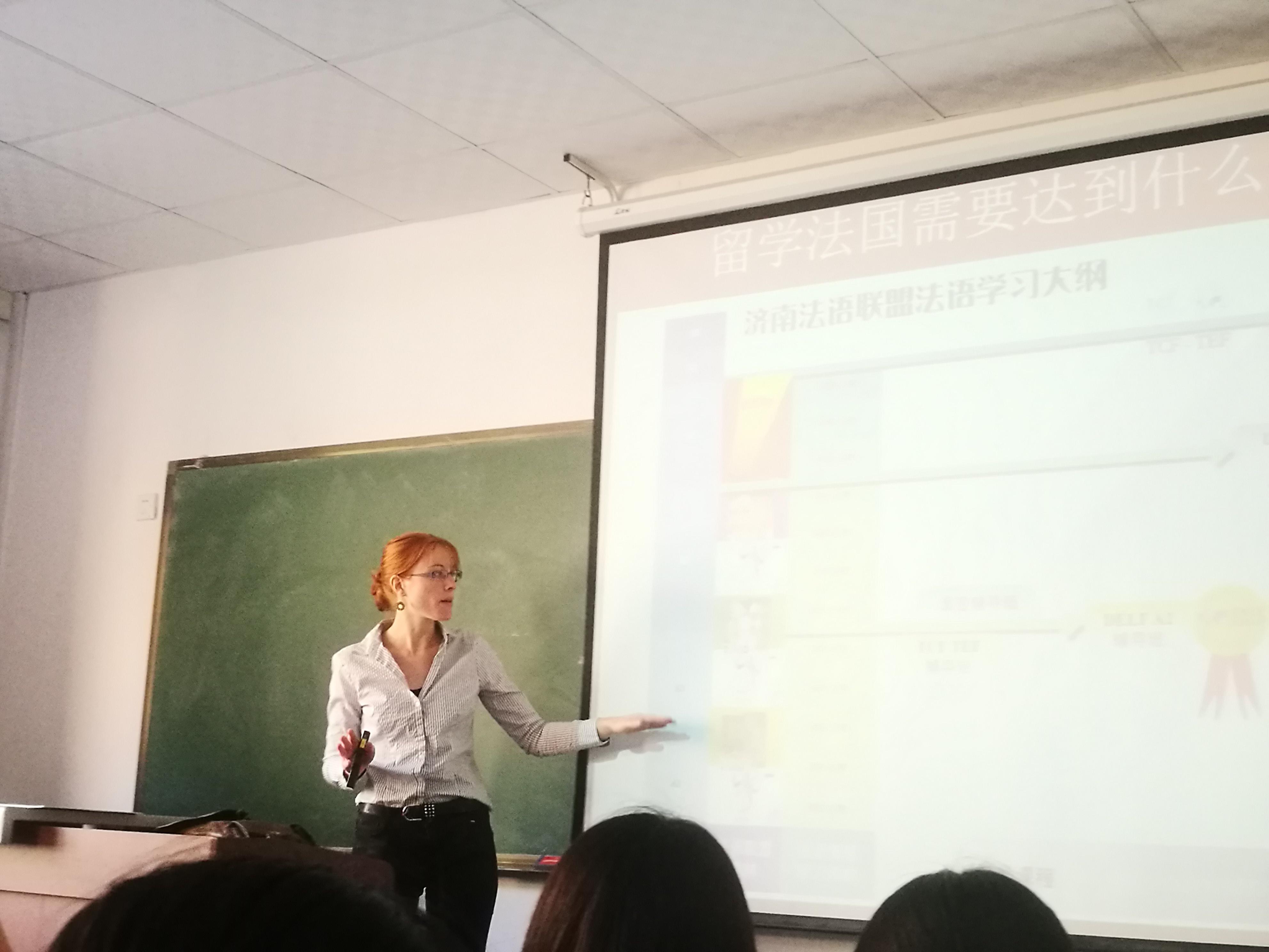法语联盟(济南)校长Miquau女士向同学们详尽的介绍了济南法盟目前所举办的文化活动,包括各种艺术展览、法语音乐会、以及各种带有文化色彩的游戏。此外,她还向大家介绍了欧洲语言框架标准下对于各个等级语言的要求,便于同学们更加了解自己目前的语言水平。