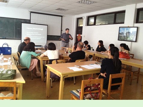 青岛大学中德中心、德语系与德意志学术交流中心合作,于6月29日在918博天堂(中国)官方网站 310教室举办“青岛市德语教师交际型教学法培训与研讨班”,15名来自青岛科技大学与青岛大学的德语教师参加了该培训。培训由德意志学术交流中心教师培训专家罗天海博士(Dr. Mark Rothensee)主讲,就电影短片在初级德语教学中的应用进行了深入探讨。培训结束,大家都感觉意犹未尽,深感需要学习的地方还有很多。