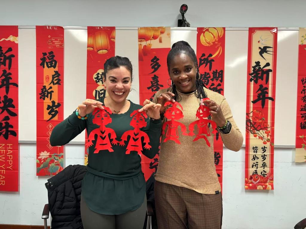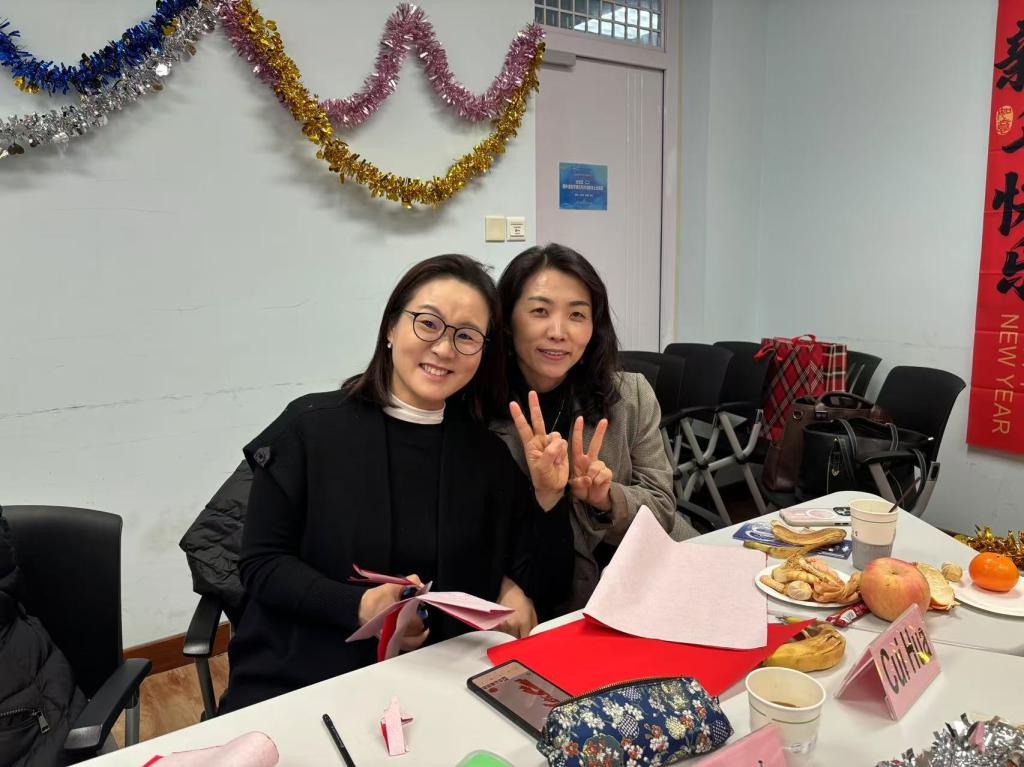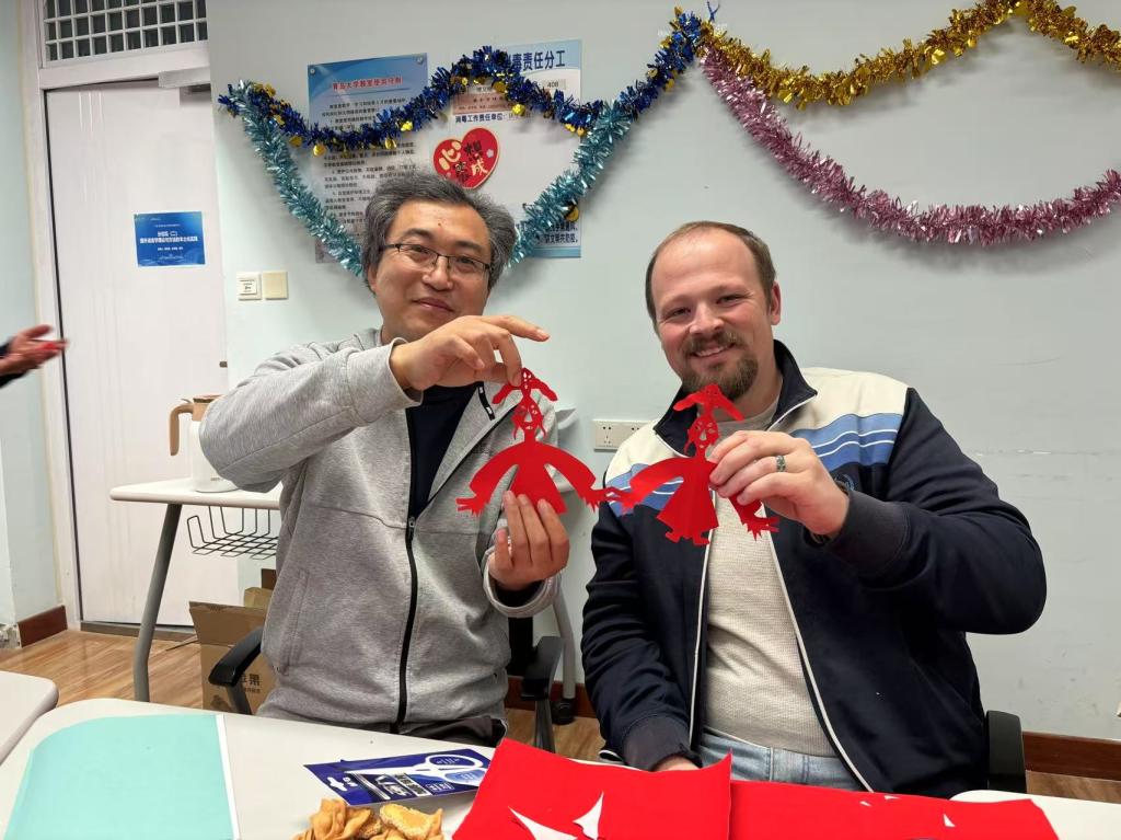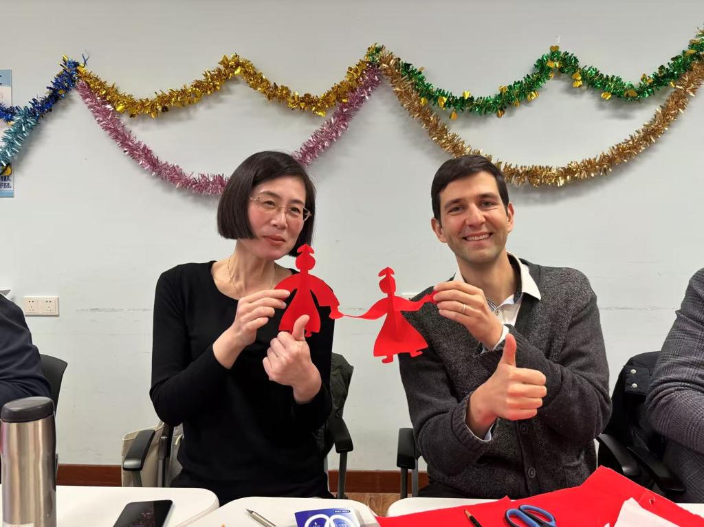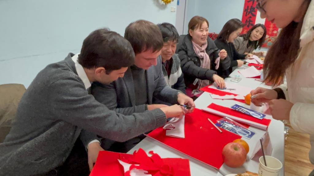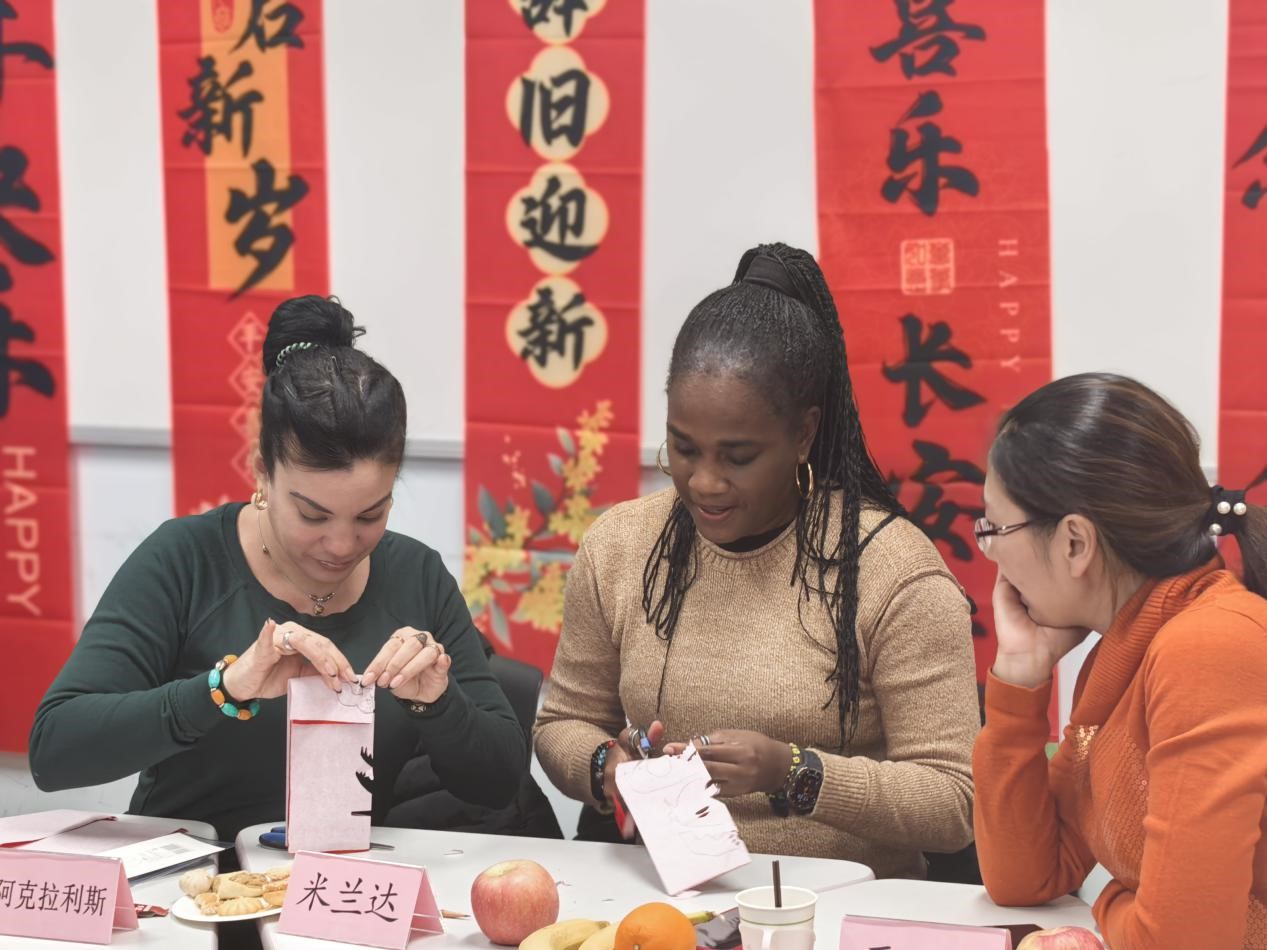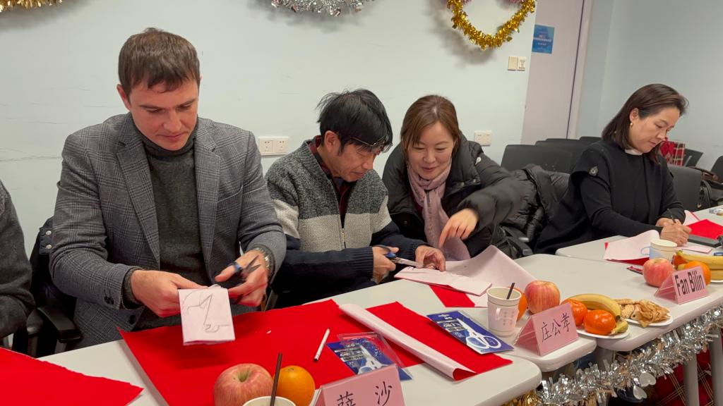 外籍专家服务的感谢,并就日常教学、国际交流等工作建言献策,提出了宝贵的建议。最后,与会人员共同体验中国剪纸,感受中国传统民俗文化,共庆新年。