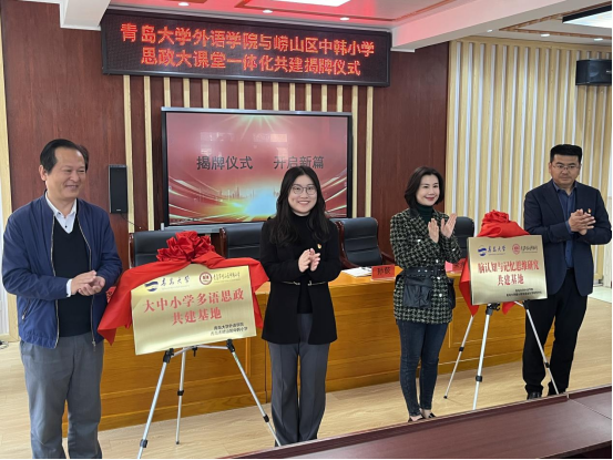 与青岛崂山区中韩小学联合举办的“大中小学多语思政共建基地”及“脑认知与语言科学研究中心共建基地”揭牌仪式在青岛崂山区中韩小学举行。918博天堂(中国)官方网站