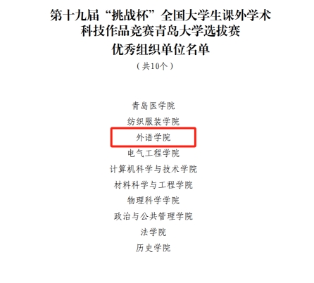 近日,共青团青岛大学委员会印发了《关于表彰第十九届“挑战杯”全国大学生课外学术科技作品竞赛青岛大学选拔赛优秀指导教师、优秀组织单位和获奖作品的决定》。