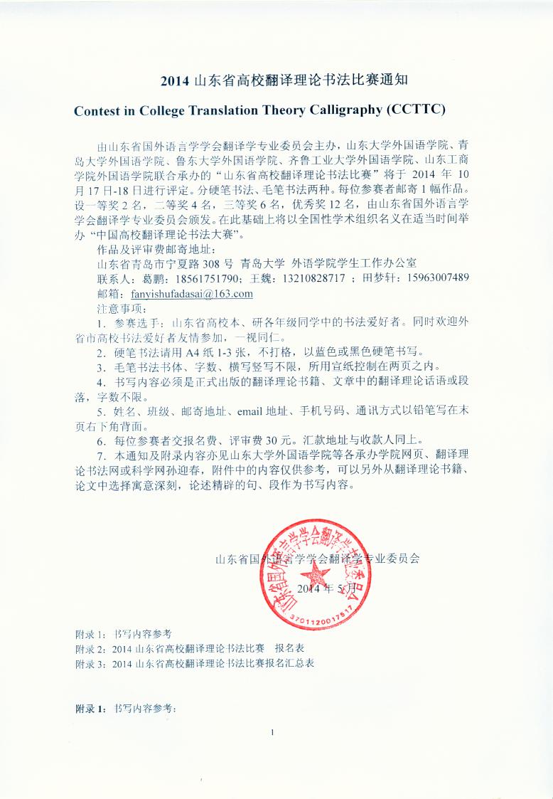 联合承办的“山东省高校翻译理论书法比赛”将于2014年10月17日-18日进行评定。分硬笔书法、毛笔书法两种。每位参赛者邮寄1幅作品。设一等奖2名,二等奖4名,三等奖6名,优秀奖12名,由山东省国外语言学学会翻译学专业委员会颁发。在此基础上将以全国性学术组织名义在适当时间举办“中国高校翻译理论书法大赛”。